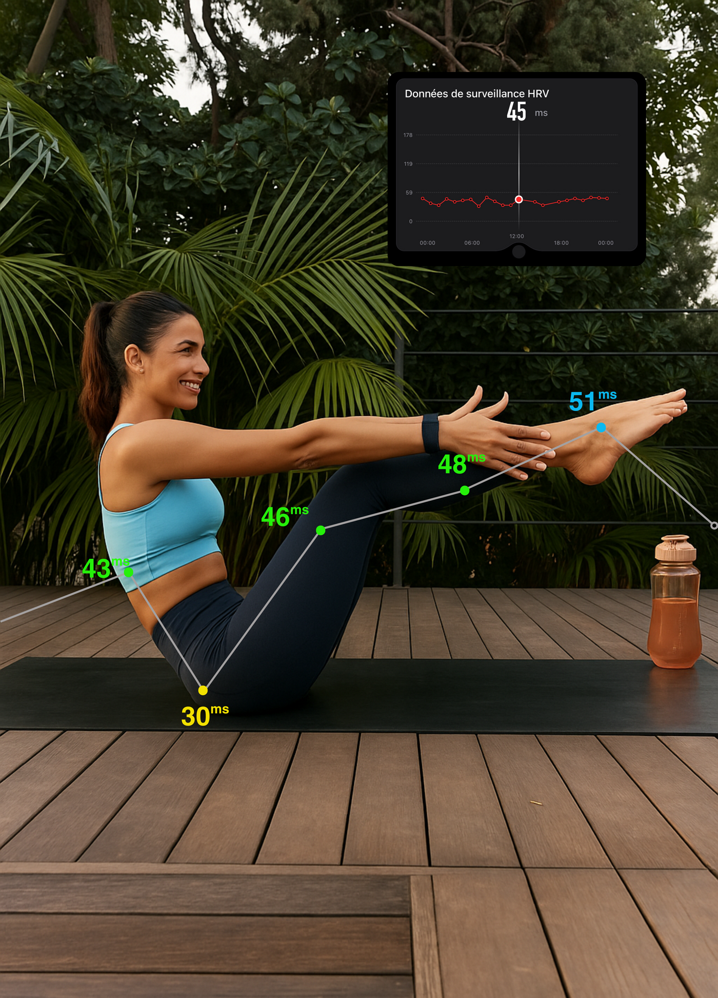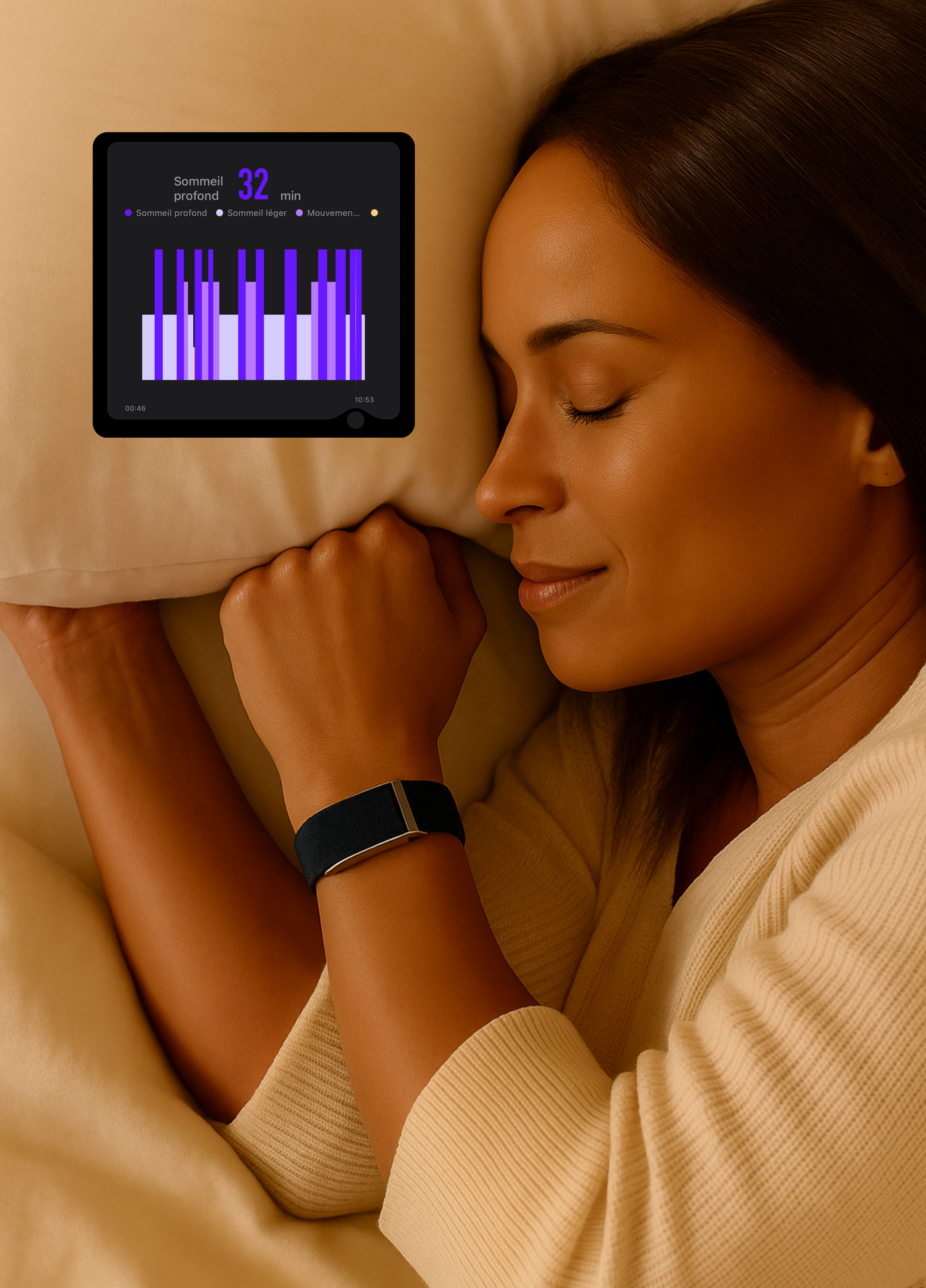 BIONNY precisely measures the four phases of your sleep – light, deep, REM and wake – to help you truly understand the quality of your nights. Thanks to this data, you identify what disrupts your recovery and make the right decisions to improve your energy, mood and performance every day.