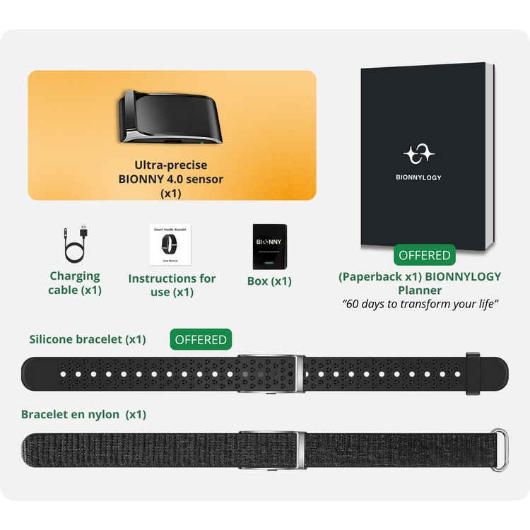 You will receive a BIONNY 4.0 sensor, a SuperTex wristband, a charger, as well as full access to the application without a subscription.